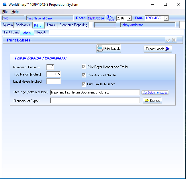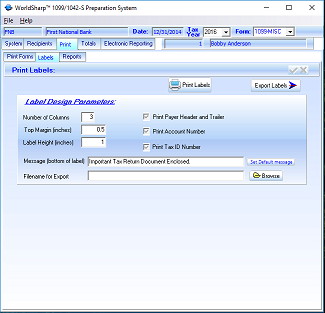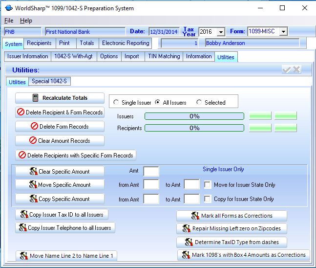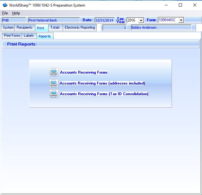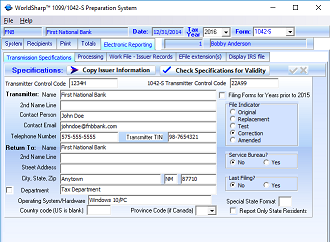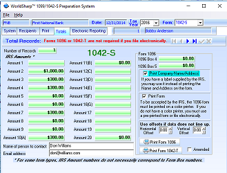 This is the main screen of the WorldSharp 1099/1042-S Preparation System. It has tabs across the top and some of the tabs have additional tabs under them. You may click on the image to the left to enlarge the screen image.