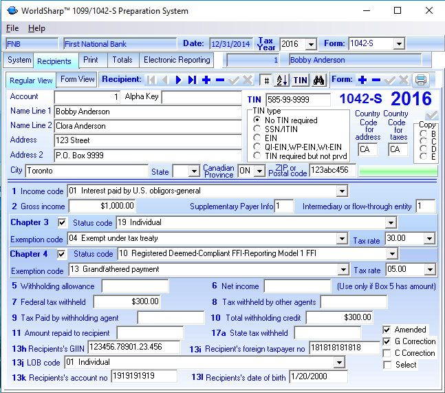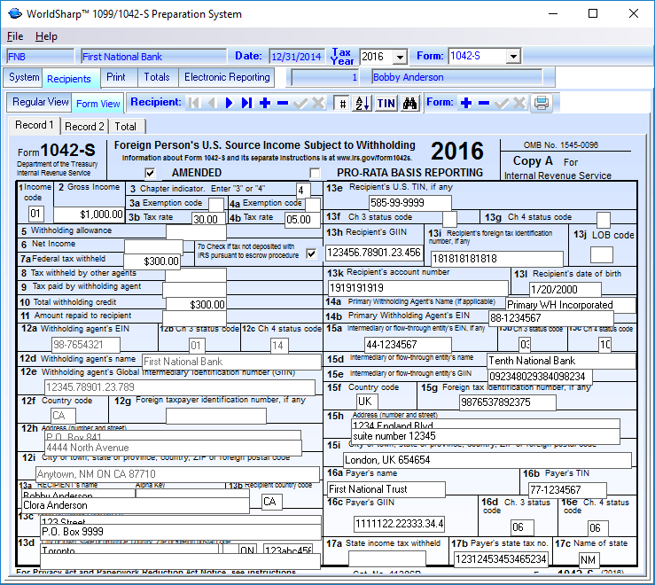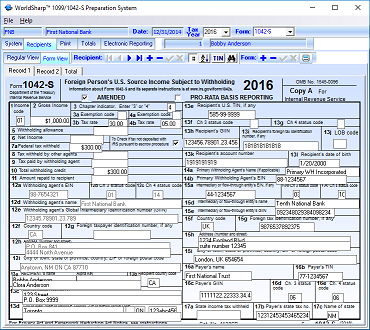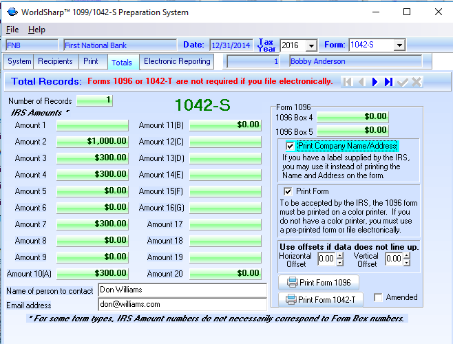 The totals of the amount fields for the 1042-S may be dislplayed or printed on a 1042-T form. The 1042-T may be printed on plain paper or a pre-printed form.