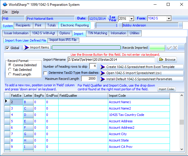 This Import screen is where the parameters can be set for importing form information from spreadsheets or comma delimited files. Templates are provided for the 1042-S and each kind of 1099 form. These template formats are not required for import, but if they are used the system will automatically populate the parameters that map the columns of the spread sheet.