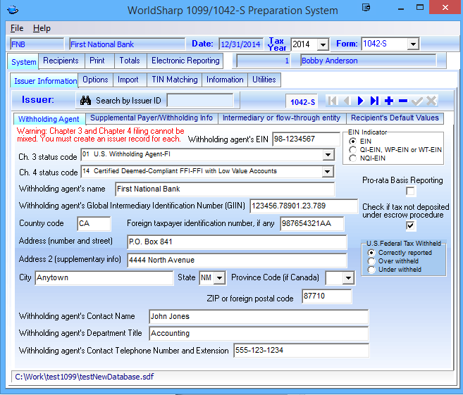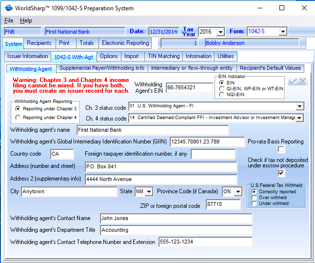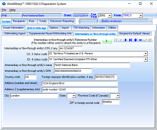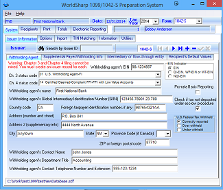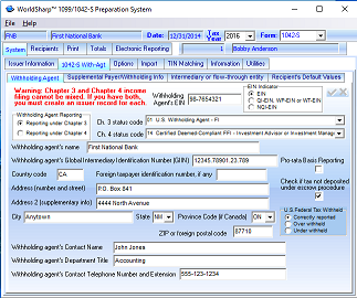 This screen allows the user to enter the Withholding agent information. There are dropdown menues to allow the user easily determine the appropriate status codes.