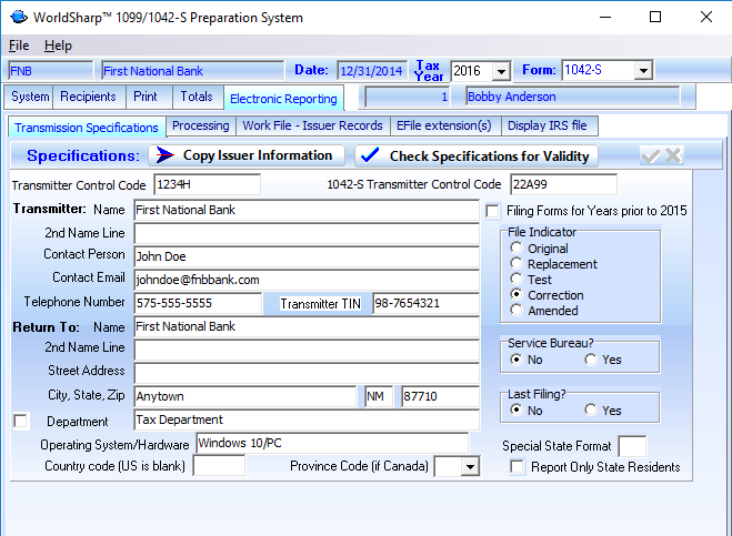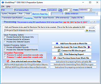 Once Transmitter Specifications have been entered, this screen is used to prepare the file to be sent to the IRS.