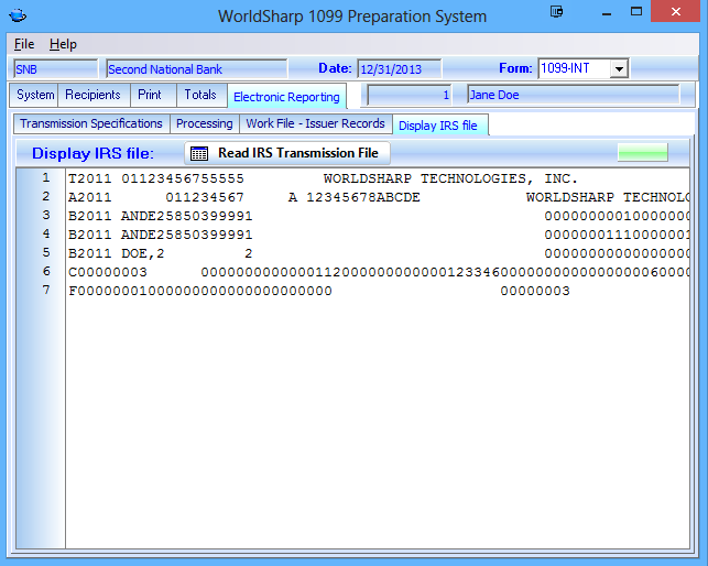 This screen will display the IRS file that is specified in the 'Processing' screen.