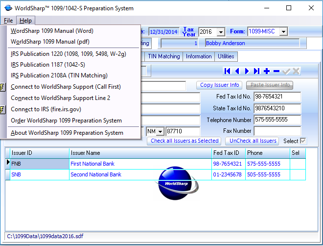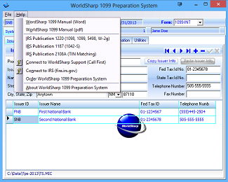 The Help menu found at the top of the screen allow the operator to access the WorldSharp 1099/1042-S Manual.