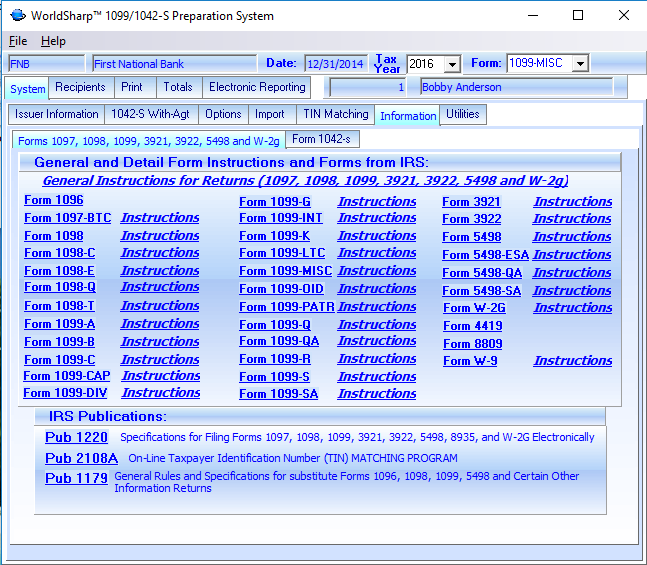 The IRS forms, instructions and publications having to do with forms 1042-s, 1097, 1098, 1099, 3921, 3922, 5498 and W-2g are provided with the system for your convenience. This keeps you from having to find them on the internet if you need to use them.