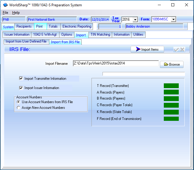 You can import the information from a file formated for transmission to the IRS.There are a number of purposes for doing this.