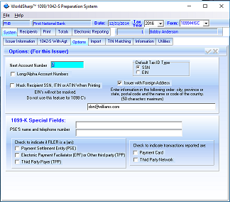 This screen allows the user to set the Tax Year. Setting the Tax Year is normally not required unless forms for previous years are being processed. Some processing options are set on this screen such as whether to 'mask' recipient's tax identification number.