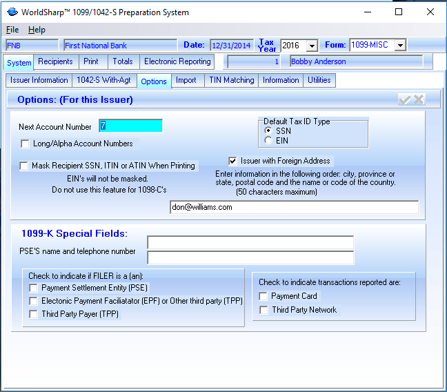 This is the screen to enter the issuer information. The grid will have a row for each issuer. Once the issuer is entered or selected, all other screens will have information for that issuer. For a company, there would probably be only one issuer, but for a CPA firm, there might be many issuer records.