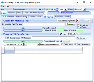 Files can be created in the format required for the IRS TIN Matching program. Certain payers may need to participate in this program. Details about the program and requirements for participation are in the IRS Publication 2108A which is provided with our system.