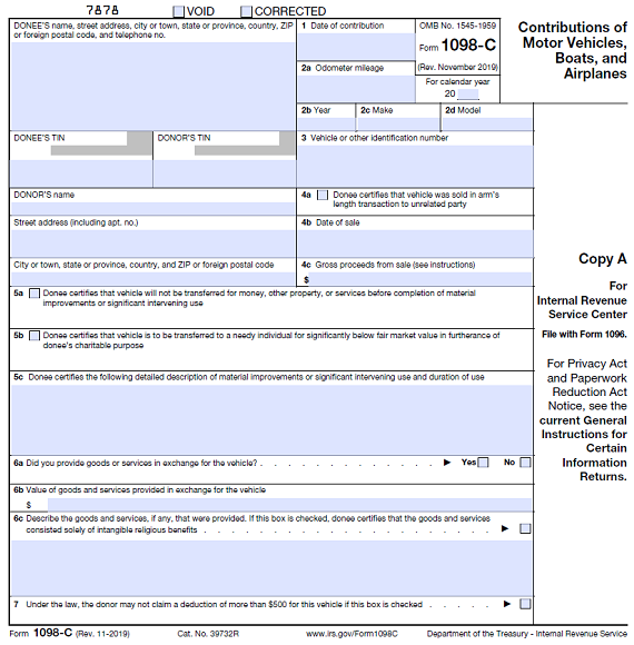 The 1098-C form is used when a donee organization receives contributions of contributions of motor vehicles, boats, and airplanes. The donor should receive a form 1098-C when the qualified vehicle has a value of more than $500.00. In general, a qualified vehicle is any motor vehicle manufactured primarily for use on public streets, roads and highways; boats; or airplanes.