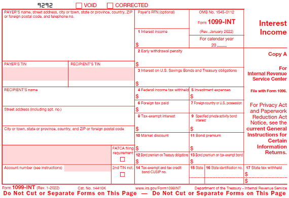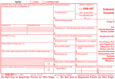 1099-INT forms are used to report taxable and tax exempt interest of $10 or more paid by a business, federal, state and local government agency. These may be also issued by a nominee/middleman handling those transactions.