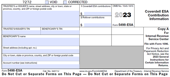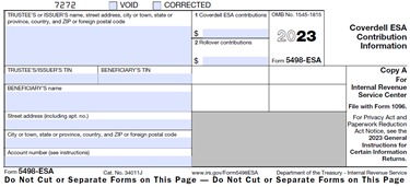 Form 5498-ESA is used to report contribution information for Coverdell educational savings account (ESA).