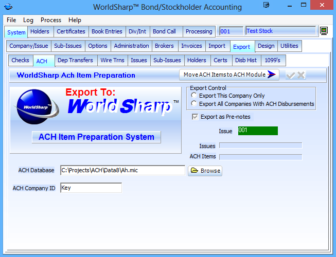 The system can be interfaced with the WorldSharp software systems that create ach items. Those may then be automatically created in the ACH system.