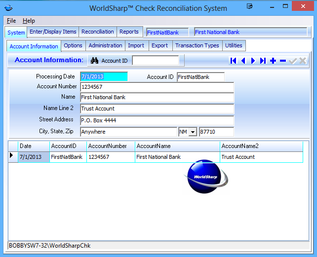 The WorldSharp™ Check Reconciliation System provides an excellent means to reconcile your own or your customer's checking accounts.