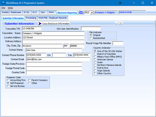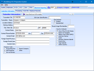 A file suitable for submitting to the Social Security Administration can be created. If the submitter information is to be the same company and the employer, there is a button that will copy the employer screen to the submitter screen/