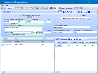 The employees are entered with the fields that are required for a W-2 form. The employee records can be accessed in SSN or Alphabetic order. Additional fields that help manage the process are email address, phone number and Employee ID or badge number. There is a provision for entering a foreign address.