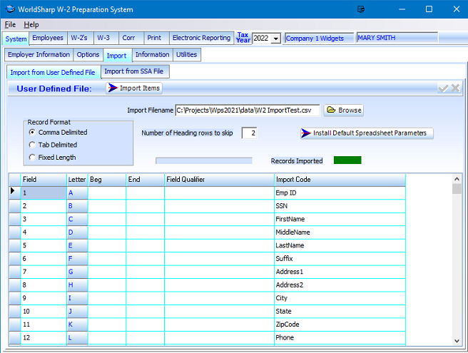 A template is provided that will have columns for each field required for importing W-2 information. Using the template allows the operator to press a button to set all of the parameters. However any arangement of the fields can be used if the operator wants to enter the parameters.