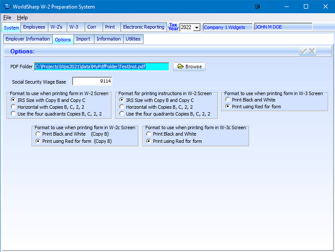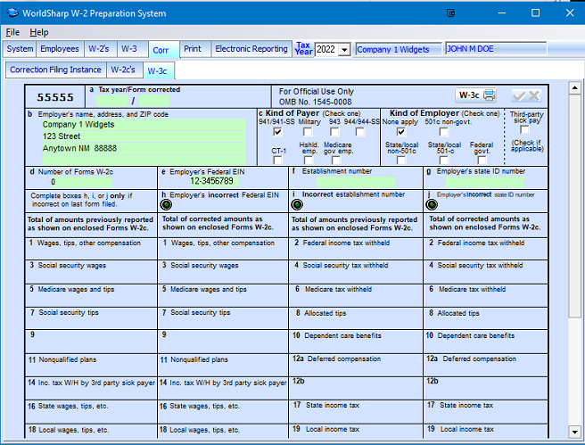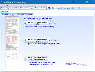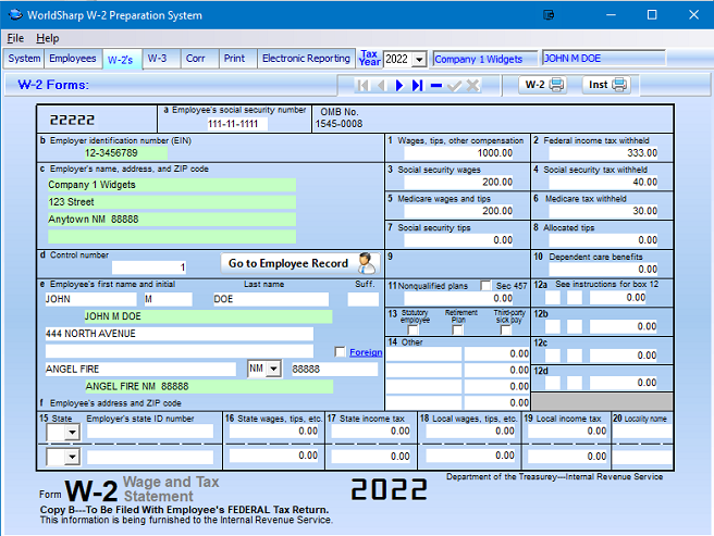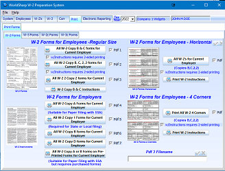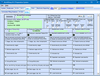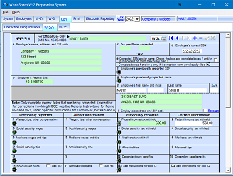 This is the main screen of the WorldSharp W-2 Preparation System. It has tabs across the top and some of the tabs have additional tabs under them. You may click on the images to the left to enlarge the screen images.