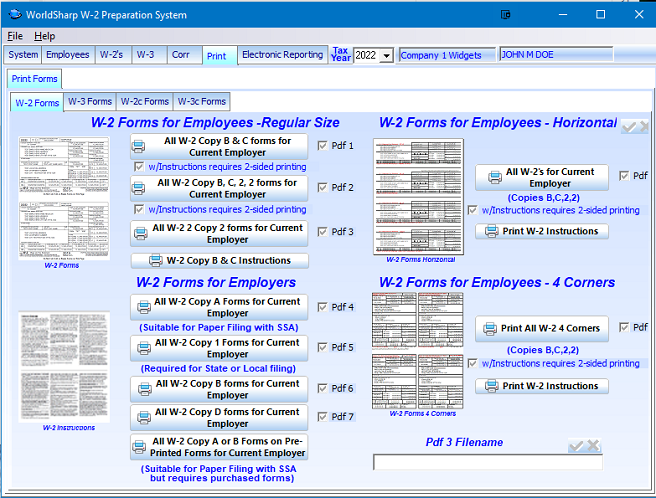 There a number of formats of W-2 forms that can be printed. There is the regular size (which is the one that the IRS provides) which is one half of a page. These can be printed in a variety of ways. The standard way is printing on one page with the Copy B on the top and Copy C on the bottom. They can be printed with instructions on back(requires a printer that prints on both sides. They can be printed to a PDF.