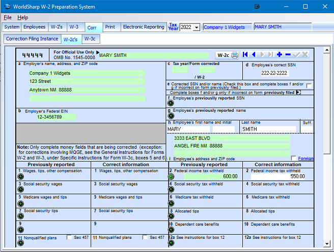 To make corrections, the green LED is pressed in the box or boxes that require correction. The amount from the original W-2 will appear on the left side of that box. Then the correct amount is to be entered on the right side of the box.