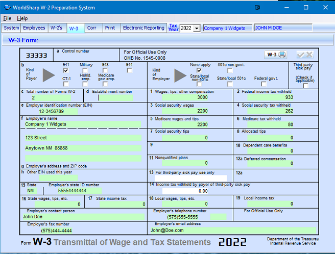 Most of the fields required for the W-3 form are automatically calculated and entered. There are a couple of fields that you will need to enter if they apply to that W-3.