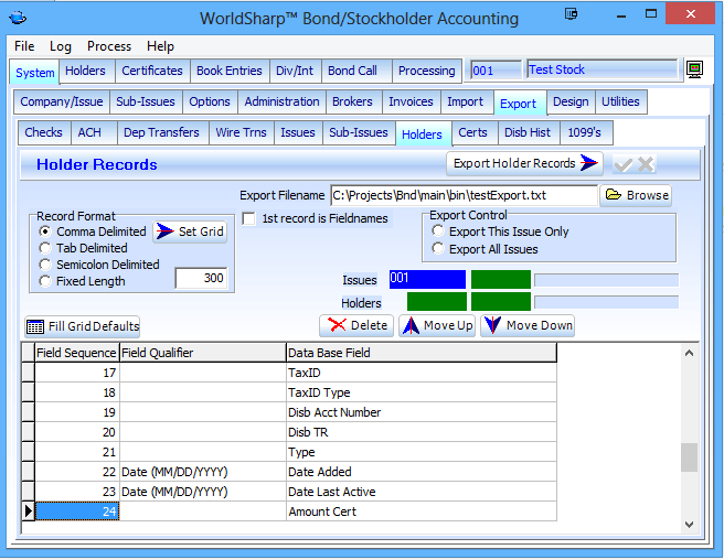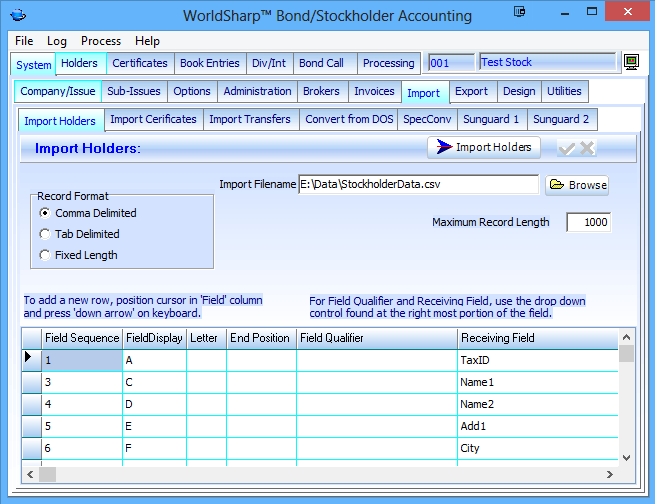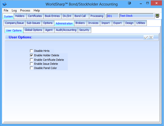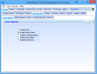 For example, in normal operation would not want to allow delete of holders or certificates, but during conversion or initial entering of information those functions might be necessary. The operator could turn on those functions and then turn them off during normal daily operation.