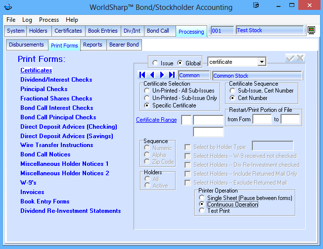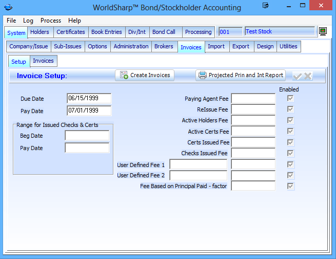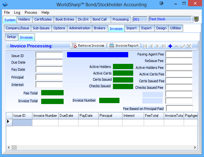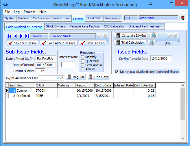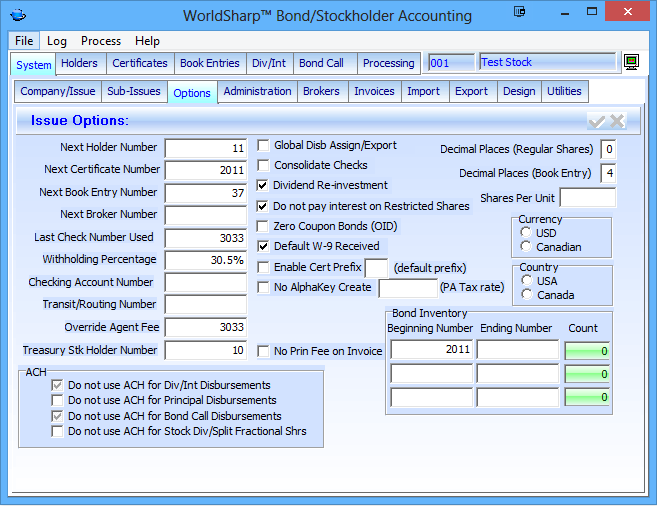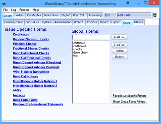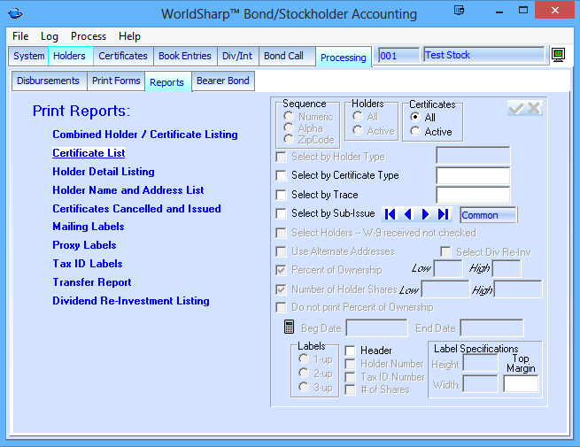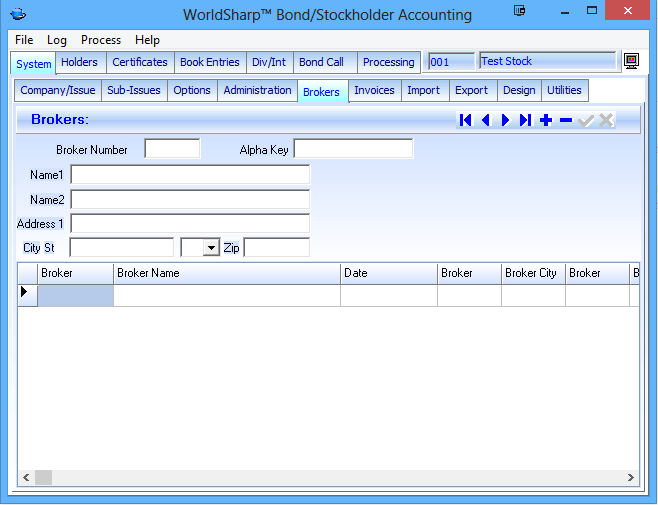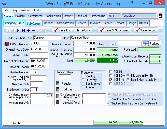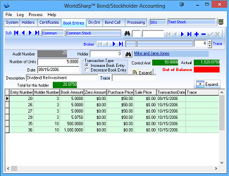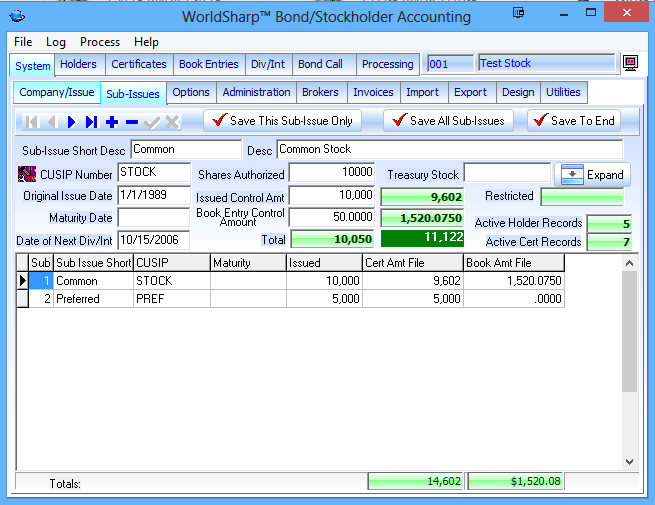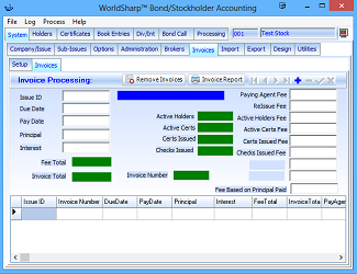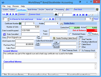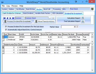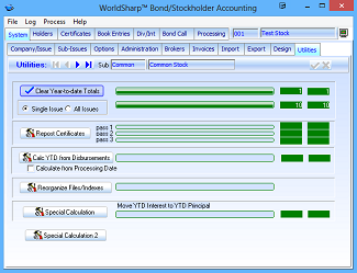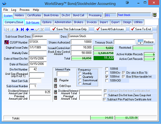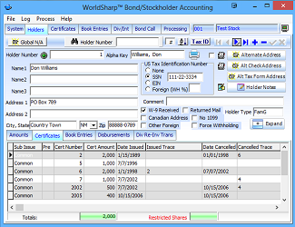 This is the main screen of the WorldSharp Bond/Stockholder Accounting System. It has tabs across the top and some of the tabs have additional tabs under them.