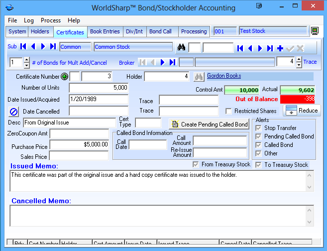 The screen also shows whether the number of shares is in balance. As certificates are cancelled, the screen shows 'Out of Balance'. And then as a new certificate or certificates are added, the screen will show that it is back in balance.