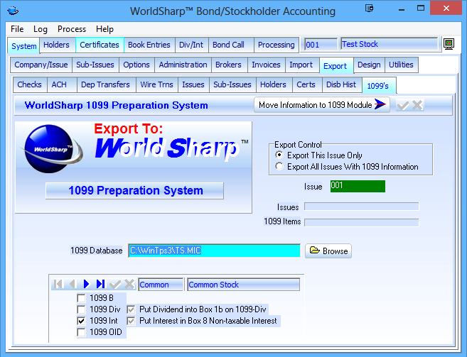 At the end of the year, information to create 1099's needs to be exported to the 'WorldSharp 1099 Preparation System'.